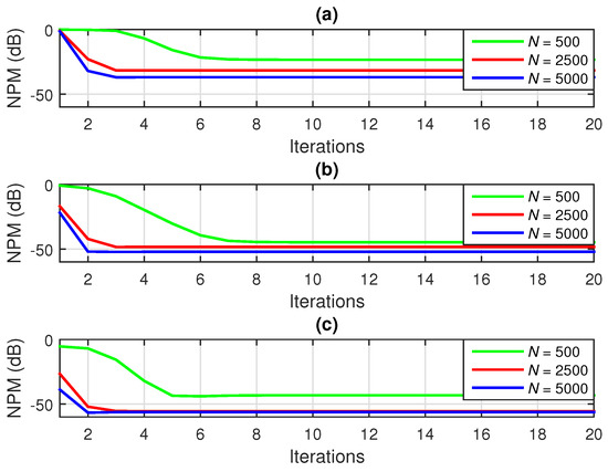 NPM of the iterative Wiener filter, for different values of the number of available data samples used to estimate the statistics (N), for the identification of the individual impulse responses from Figure 1a–c: (a) , (b) , and (c) . The input signals are AR(1) processes, , , , and .