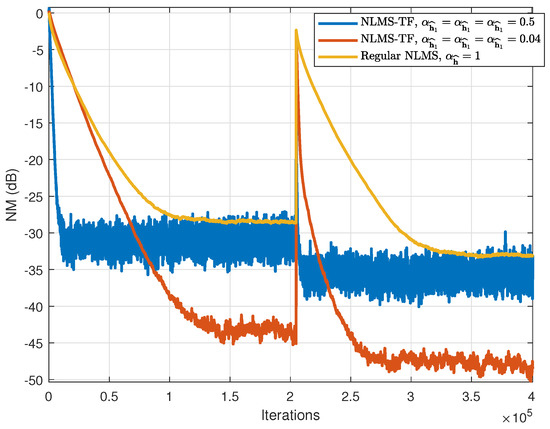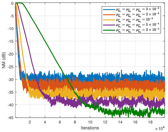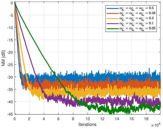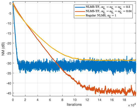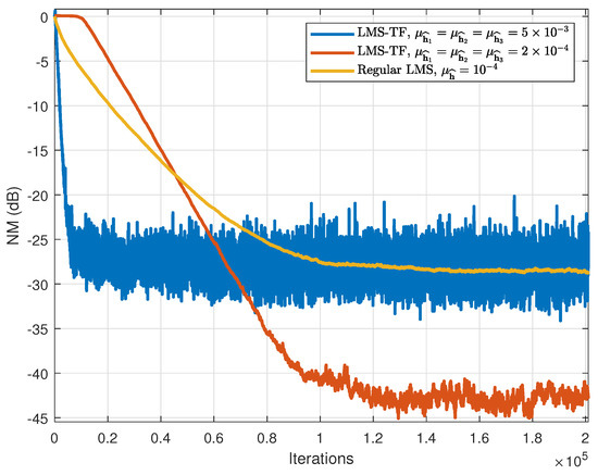 It can be seen that if the step-sizes take large values, the LMS-TF algorithm reaches convergence after less than iterations. Then, as these values decrease, the convergence becomes slower but the steady-state value of the NM also decreases, highlighting the compromise between convergence rate and NM value.