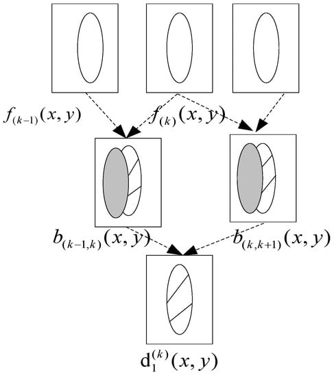 (2) Take a threshold for and , respectively, to binarize and obtain two binarized images, and . The logical and operation of and at each pixel position is performed to obtain a binary image of symmetric difference results. The calculation formula is as follows: