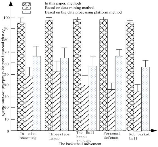 The data in Table 5 concludes that the basketball action data processing method based on the mode symmetric algorithm took less time to process basketball data of different data volumes. Average processing, in-situ shooting, three-step layup, ball break, personal defense, and basket-fighting action data are 0.09 s, 0.06 s, 0.12 s, 0.10 s, and 0.15 s, respectively, both lower than data mining and big data. The processing platform processing time was consuming, and the comparison results showed that the method had strong processing efficiency in processing basketball action data, and the practical application effect was good.