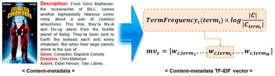 Content-metadata is given as a set of sentences (term sequence) describing content features. After crawling content-metadata that is easily accessible on the web, we converted this content-metadata to a TF-IDF (term frequency-inverse document frequency) vector whose component represents a TF-IDF score for each term using general information retrieval techniques.
