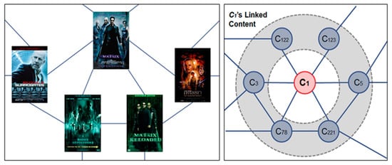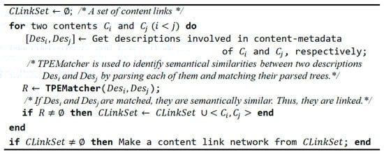 We also built a content link network by extracting associative relationships between content items using tree pattern expression (TPE)-based text mining process [33,34,35]. In this process, the content link network was constructed by connecting content items whose metadata contains the same TPE semantic patterns and significant terms. For example, if two content items share similar metadata descriptions, containing many common terms and semantic structures, such as in “The Matrix” movie series, these content items would be connected with each other in TPE-based text mining process. Figure 2 describes a detailed pseudocode to construct the content link network using TPEMatcher [34], a TPE-based pattern matching and mining tool.