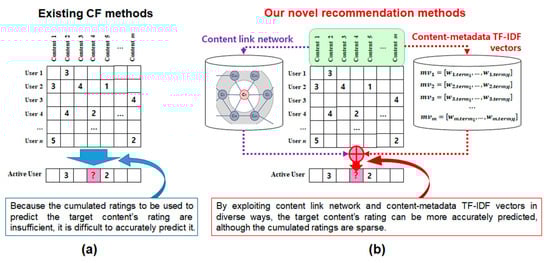 Content-metadata, textual information that describes content features, has been used widely in many information retrieval and extraction applications [21,30,31,32]. In our work, our key intuition is that this content-metadata can be used effectively in a different way from existing methods to enhance performance. Because content-metadata involves general information and key features of content, it can be utilized to extract mutual relationships between the content. By applying the mutual relationships effectively into existing CF methods, significant performance improvement can be achieved, especially under a sparse rating environment.
