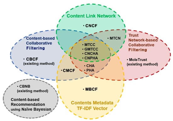 In this section, we developed several boosting approaches by incorporating the two content-metadata-based representations into conventional CF methods in different ways as follows: (i) Content and metadata-based CF (CMCF); (ii) the combined harmonic approach (CHA); (iii) the priority-based harmonic approach (PHA); (iv) content link network-based CF (CNCF); (v) MoleTrust combined with CNCF (MTCN); (vi) MoleTrust combined with CNCF and CMCF (MTCC); (vii) generalized MTCC (GMTCC); (viii) CNCF combined with CHA (CNCHA); and (ix) CNCF combined with PHA (CNPHA). These approaches combine content-metadata with traditional item-based CF (termed content-based CF, CBCF) and/or a trust network-based CF (MoleTrust). Figure 5 depicts our approaches, other existing CF methods, and their intersecting relationships. The detailed methods of our boosting approaches are described in Section 3.2, Section 3.3, Section 3.4, Section 3.5, Section 3.6, Section 3.7, Section 3.8, Section 3.9 and Section 3.10.
