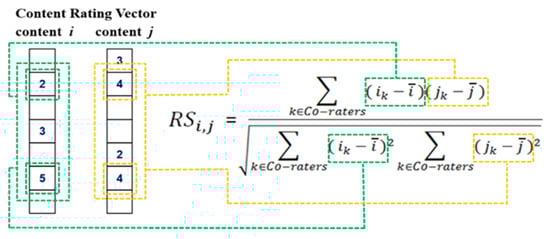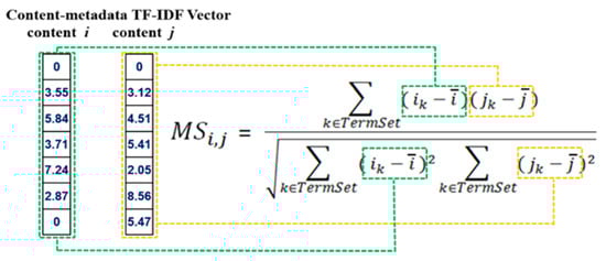 CMCF uses content-metadata to complement the process of calculating inter-similarities between content items in traditional CBCF. More concretely, if the number of co-raters for two content items i and j is less than a threshold τ, then the content similarity () (based on user-content ratings) is combined with the similarity (), based on content-metadata. is represented by the correlation coefficient [36] between two co-rating scores of content items i and j, as shown in Figure 6, and is represented in the same way as except for using TF-IDF vectors of the two content items, as shown in Figure 7.