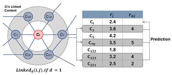 After finding the linked content items in the content link network, the CNCF rating score is calculated as in Equation (6), where N is a set of content items rated by an active user a and returns whether content items i and j are linked to each other (True = 1 or False = 0) within depth d in the content link network.