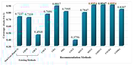 The coverage performances of the recommendation methods are shown in Figure 10. Most of our methods show dramatically improved coverage performance when compared to the existing methods. Especially, CHA, MTCC, GMTCC, CNCHA, and CNPHA show excellent coverage performance over 0.8, which is a notable result when considering the coverage performance, about 0.7 of MoleTrust and CBNB. Specifically, MTCC and CNCHA show the best coverage performance, 0.8954. It indicates that our methods increased the number of predictable user-content ratings considerably by combining content-metadata and trust network. It is because content-metadata provides additional information effectively to compute the rating scores of target contents, regardless of the amount of accumulated user-content ratings in the recommendation system. On the other hand, CBCF and CNCF show the worst coverage performances (0.4568 and 0.3796, respectively), even though they use content-metadata. These results imply that using content-metadata complementarily along with other information such as a trust network can contribute significantly to predicting more user-content ratings than using content-metadata only.