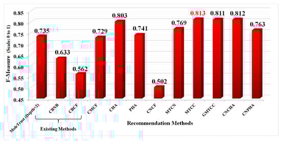 To evaluate the overall performance of the CF methods, we used the F-measure, that is, the harmonic mean of precision and coverage as shown in Equation (16). This measure, which represents a single metric of the effectiveness of the CF method, is bound by 0 and 1.