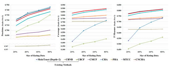 As shown in Figure 12, all recommendation methods show a gradual increase in precision as the size of the user-content rating set increases. Relative to the existing methods, our content-metadata-based boosting approaches show almost the same or a slightly higher level of precision on average. In terms of coverage and F-measure, our methods all outperform the existing methods for all the sizes of user-content rating data. Specifically, MTCC and CNCHA show the highest performance and CHA also shows much higher performance than the existing methods for all the sizes of rating data. Particularly, the outperformance of our methods is more highlighted when the rating data is very sparse.