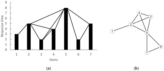 Example of the construction of a natural visibility graph (NVG). On the left (a), the integrated response time series for a sample of items. On the right (b), the NVG associated with the time series. The label of each node corresponds with the number of the item in the series. Two nodes (items) are connected by an edge if they can see each other.