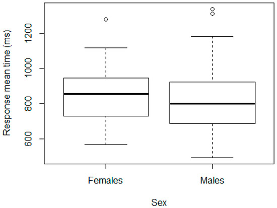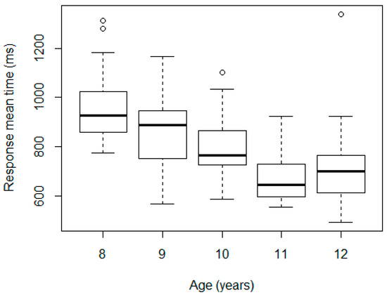 In contrast, the Kruskal-Wallis test revealed statistically significant differences by age (p-value of 5.27 × 10−10). Specifically, there were differences for ages between 8 and 9 years, 9 and 10 years, and 10 and 11 years, but not between 11 and 12 years, according to the Wilcoxon test. We repeated the test after eliminating the outlier in the 12-year-old group and the result did not vary. These results are consistent with the findings on how reaction times evolve with age [38,61,62,63,64]. A linear model was adjusted taking the logarithm of RT mean as the dependent variable, and age and sex as the fixed-effect factors, obtaining the same results: significant differences across ages 8 and 9 years (10% less RT mean, p-value = 0.01); 9 and 10 years (8% less, p-value = 0.05); 10 and 11 years (15% less, p-value < 0.01); and not between sexes (p-value for sex 0.82).