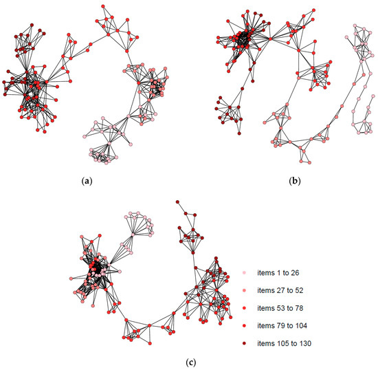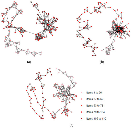 The respective NVGs of participants 39, 77, and 103. (a) Natural visibility graph of participant 39; (b) Natural visibility graph of participant 77; (c) Natural visibility graph of participant 103.