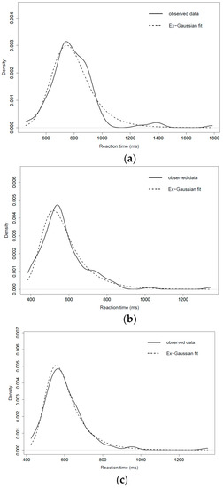 - Gu, S.H.; Gau, S.S.; Tzang, S.; Hsu, W. The ex-Gaussian distribution of reaction times in adolescents with attention-deficit/hyperactivity disorder. Res. Dev. Disabil. 2013, 34, 3709–3719. [Google Scholar] [PubMed]