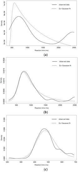 Ex-Gaussian fit of RTs of participants 89, 120, and 84 (continuous line represents observed data, dashed line represents fitted data). (a) Ex-Gaussian fit of RTs of participant 89; (b) Ex-Gaussian fit of RTs of participant 120; (c) Ex-Gaussian fit of RTs of participant 84.