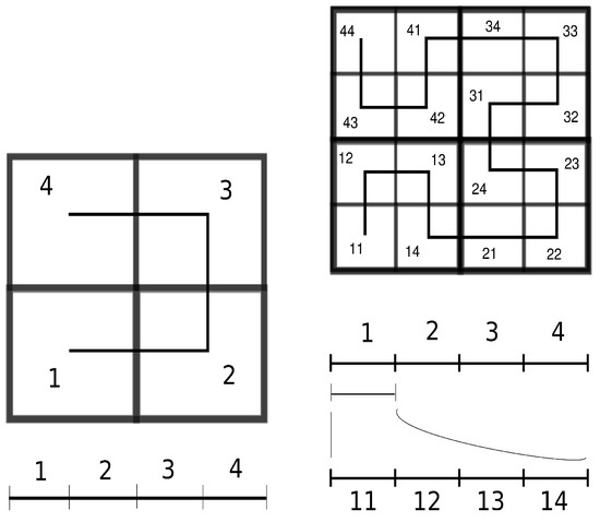 Next, we illustrate how Theorem 24 allows the construction of functions for Theorem 23 application purposes. In this way, let us show how the classical Hilbert’s square-filling curve can be iteratively described by levels.