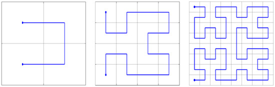 First three levels in the construction of the Hilbert’s curve according to Theorem 24 (c.f. ([20], Figure 2)).