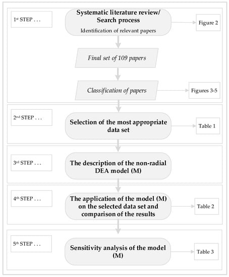 With the aim to present the novelty of this paper and to better describe the process of the introduction of our model in the SC efficiency evaluation, a sequence of steps, represented in Figure 1, were performed: (1) systematic literature research; (2) selection of the paper with the most appropriate data set used; (3) the description of the non-radial DEA model itself; (4) the application of the non-radial DEA model using the selected set of data and comparison of the results; and (5) sensitivity analysis of the proposed model.