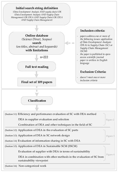 The search of databases using keywords such as “Data Envelopment Analysis AND Supply Chain”, “Data Envelopment Analysis AND Supply Chain Management”, and the variations of both search strings where the abbreviations DEA, SC, and SCM were used, was performed in both databases. Papers that presented an application of the DEA in the SCM field were taken over by first reading the title, keywords, and abstracts. After the initial reading, 222 papers were extracted. Further, after the full-text reading of extracted papers, 109 were selected and considered relevant. Based on the review, the selected papers were classified into main areas such as the evaluation of the SC, the evaluation and the selection of suppliers, as well as the consideration of the SC and the evaluation of suppliers in terms of sustainability. Also, for each of these categories, the application of DEA in combination with other methods was presented. However, those papers that used the DEA method for analyzing more than one aspect or where the DEA was combined with another method or methods were classified as non-categorized. The overall search process is shown in Figure 2.