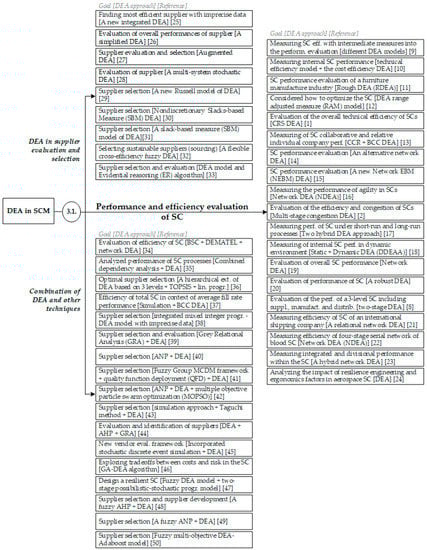 For the evaluation of SC performances, the DEA method has been extensively employed. Previously, with the DEA method, only the initial inputs and final outputs to measure the efficiency of SCs were used, while intermediate products were ignored. However, the application of the DEA method for measuring the efficiency of the entire SC and all its components at all levels was recognized in ref. []. The application of DEA for performance and efficiency evaluation of SCs is summarized in Figure 3.