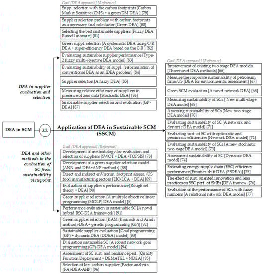 DEA in the evaluation of SC parts, in SC network design, and in the improvement of information sharing among SC stakeholders [,,,,,,,,,,,,,,].