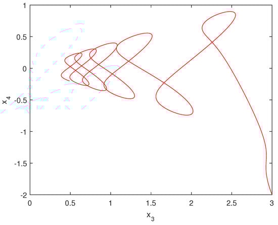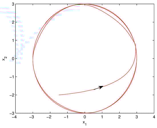 Shows phase portrait of the states of the system (29) converges to a circle with radius 3 as .