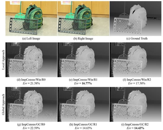 Figure 1 shows the results of the ImpCensus-based stereo matching algorithms using the Backpack stereo images with different R values. Disparity maps in the second line are the result of the ImpCensus-based local algorithms, whereas the third line shows the disparity maps of the ImpCensus-based global algorithms. Census/Win and Census/GC produced the most erroneous disparity maps because they were un-aware of the imperfect rectification problem. ImpCensus/GC/R1 and ImpCensus/GC/R2 reduced the error rates. The error rate reduction is clearly seen from Figure 1g,h, especially in textured image regions. These observations agree with those in [] that the imperfect rectification problem commonly happens in textured image regions.