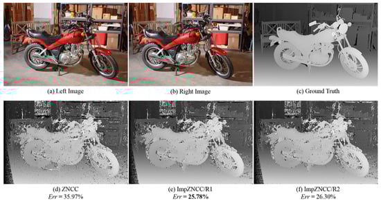 Figure 2 shows the results of the ImpZNCC matching cost functions with different R values using the Motorcycle stereo images. Figure 2a,b show the left and right images, whereas the ground truth of the left image is shown in Figure 2c. Disparity maps of ZNCC, ImpZNCC/R1, and ImpZNCC/R1 are shown in Figure 2d–f, respectively. ZNCC produced the most erroneous disparity maps with an average error rate of 49.02% because ZNCC ignores the imperfect rectification problem. ImpZNCC/R1 and ImpZNCC/R2 reduced the error rates with average error rates of 43.73% and 43.64%, respectively.