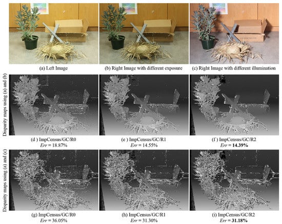 In the present experiments, because Census is one of the most robust matching functions for stereo images with radiometric distortions [], we use only the ImpCensus-based global stereo matching algorithms. Figure 3 shows the results of Census/GC, ImpCensus/GC/R1, and ImpCensus/GC/R2 using two stereo pairs. The second line shows the disparity maps of the test stereo matching algorithms using a stereo pair (a) and (b) with varying exposure and imperfect rectification, whereas the third line shows the disparity maps using a stereo pair (a) and (c) with varying illumination and imperfect rectification. The error rates of ImpCensus/GC/R1 and ImpCensus/GC/R2 were smaller than those of Census/GC in the two stereo pairs.