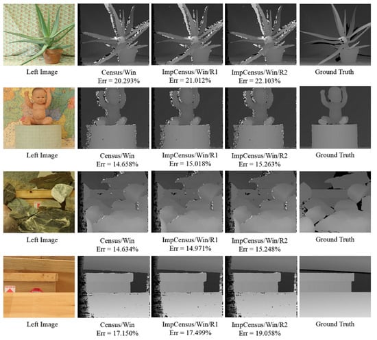 We conducted experiments to evaluate the performance of Census, Rank, ImpCensus, and ImpRank matching cost functions in local and global stereo matching approaches. Denote ImpCensus/Win/R1 as a local stereo matching algorithm that uses the ImpCensus matching cost function with to construct and aggregates matching costs using a window. In addition, denote ImpCensus/GC/R1 as a global stereo matching algorithm that uses ImpCensus with and GC to globally optimize the energy function, as described in Equation (2). Similarly, other denoted stereo matching algorithms can be used by changing the matching cost functions and the R values.