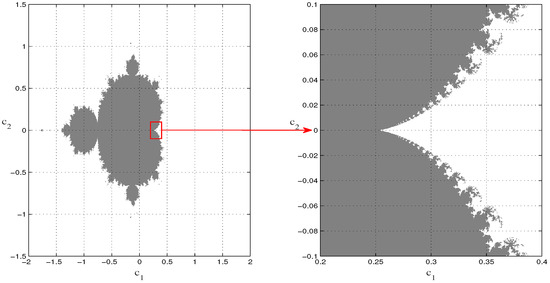 Setting as the escape time limit and as the escape radius (the same parameter selection used in [28,29]), the value of the distance r of the iteration of from the original point is calculated. Then, all the original points with form the classical Mandelbrot set (see Figure 1).