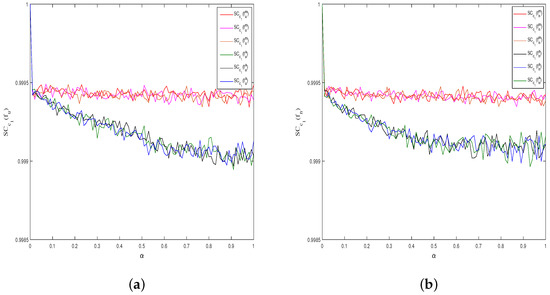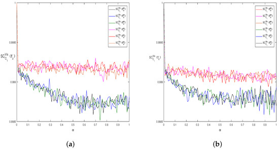 With the above method, we use different colors to depict the three groups of curves with in Figure 4a and curves with in Figure 4b. The three groups’ curves seem to conform to the same statistical law, which can be summarized as follows: