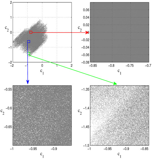 Based on the software MATLAB 2014a, the escape-time algorithm [2] that numerically calculates is briefly discussed: The lattice is constructed as the space of initial points , i.e., , . Then, the initial two intervals are divided into smaller lattices. As a result, the points in the lattice L are obtained with the following coordinates: