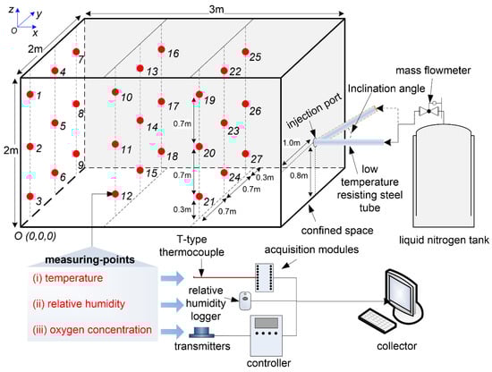 Figure 1 depicts a sketch diagram of the experimental setup. The equipment consists of a confined space, an LN2 injection system, and a data acquisition system. The experimental confined space was a cuboid steel framework (3 m in length, 2 m in width, and 2 m in height) packaged with plastic films. The symphyses between the films were conglutinated with scotch tape to ensure certain air tightness. The LN2 injection system consisted of an LN2 self-pressurization buffer tank with an effective working pressure more than 0.1 MPa, a mass flowmeter with a scale flow of 0–3000 kg/h, and an accuracy level of ±0.1% full scale (FS), and a low-temperature resistance steel pipe. The data acquisition system consisted of twenty-seven T-type thermocouples, twenty-seven OMEGA OM-62 relative humidity (RH) data loggers (a measurement range 10–90% RH and a resolution of 0.01% RH), twenty-seven 4OXV oxygen concentration sensors (a measurement range of 0–25 vol %, an offset less than 0.6 vol %, and data acquisition frequency of 0.5 Hz), two OMB-DAQ-2416 Series data acquisition modules with 16 channels and TracerDAQ software supplied, twenty-seven oxygen concentration transmitters, four controllers, and a computer. Twenty-seven measurement points were regularly arranged in the confined space, each equipped with a T-type thermocouple, a relative humidity data logger, and an oxygen concentration sensor. The temperature, relative humidity, and oxygen concentration at each measurement point could be monitored, stored, and displayed on the computer in real-time via the data acquisition system. Figure 1 also shows that a three-dimensional coordinate system is established with Point ‘O’ as the coordinate origin. The coordinate point of the LN2 injection port was set to (3.0, 1.0, 0.8).