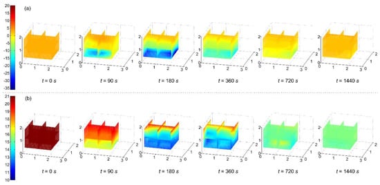 Temperatures (a) and oxygen concentrations (b) on six slices of x = 0.0, 1.0, 2.0 m, y = 1.0 m, z = 0.3, 1.0 m at 0, 90, 180, 360, 720, and 1440 s.
