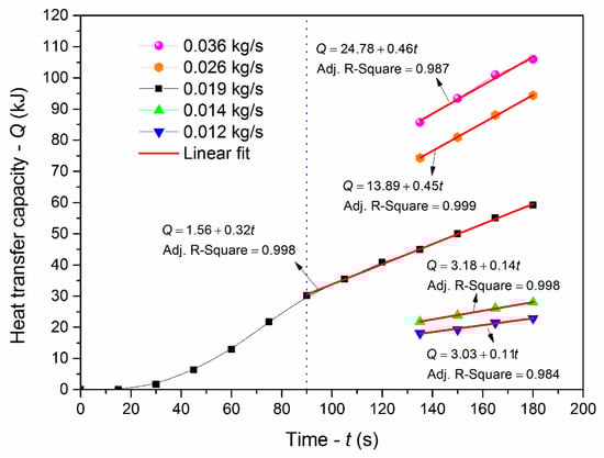 Figure 3 shows the plot of heat transfer capacity versus the time with different mass fluxes. When the mass flux was 0.019 kg/s, the heat transfer capacity ascends in a curve with time less than 80 s. The increasing rate of the heat transfer capacity increased firstly, then decreased and finally remained unchanged. Because there was a temperature difference between LN2 and the low-temperature resistance steel pipe in the LN2 flowing process, LN2 absorbed the heat and vaporized. However, as the pipe temperature decreased, the vapor–liquid ratio of LN2 gradually reached a balance. The pipe inner surface temperature decreased to a certain degree after 80 s; the gas–liquid two-phase flow was in a saturated state. There was a clear linear relationship between the heat transfer capacity and time. It could be expressed as Equation (11),