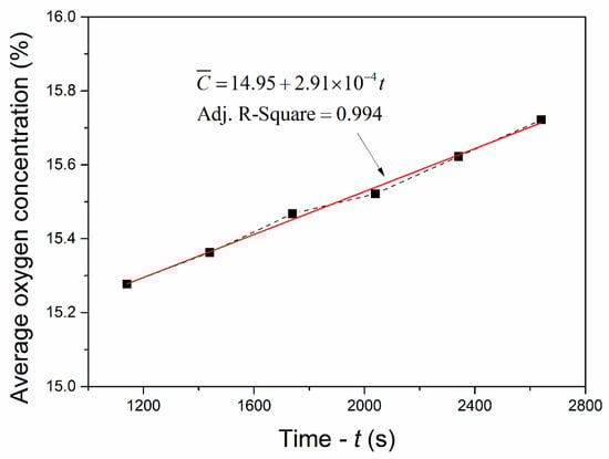 In order to verify the sealing property of the experimental confined space, the variation of the average oxygen concentrations in the confined space with increasing time (≥1140 s) was analyzed. As shown in Figure 4, the average oxygen concentration increased slowly and linearly with time because the confined space was not completely closed. The variation rate of the average oxygen concentration was equal to the slope of a linear fitting, which was 2.91 × 10–4%/s and very small, indicating that the experimental confined space was of certain air tightness. It was feasible for revealing the cooling and inerting features of LN2 in confined spaces.