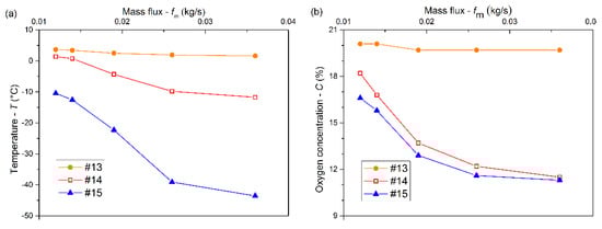 Temperatures (a) and oxygen concentrations (b) at measuring points #13, #14, and #15 versus mass flux at 180 s.