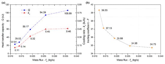 Cooling rate and heat transfer capacity at 180 s (a), inerting coefficient at 180 s (b) versus mass flux.