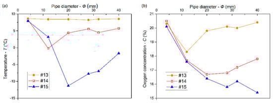 Temperatures (a) and oxygen concentrations (b) at measuring points #13, #14, and #15 versus pipe diameter at 180 s.
