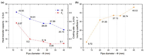 Cooling rate and heat transfer capacity at 180 s (a), inerting coefficient at 180 s (b) versus pipe diameter.