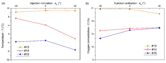 In terms of the same injection duration of 180 s, the variations in the temperatures and oxygen concentrations at the measurement points #13, #14, and #15 under different inclination angles are shown in Figure 9. As shown in Figure 9a, the temperatures at #14 and #15 decreased gradually with inclination angle ranging from –30° to +30°, while the temperature at #13 basically remained the same. It indicated that the cooling effect in the space of z ≤ 1.0 m was gradually enhanced by increasing inclination angle. As shown in Figure 9b, the oxygen concentrations at #13, #14, and #15 gradually converged with an inclination angle ranging from –30° to +30°. The mixed effect of the gases in the confined space was improved as the inclination angle increased.