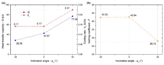 Cooling rate and heat transfer capacity at 180 s (a), inerting coefficient at 180 s (b) versus inclination angle.