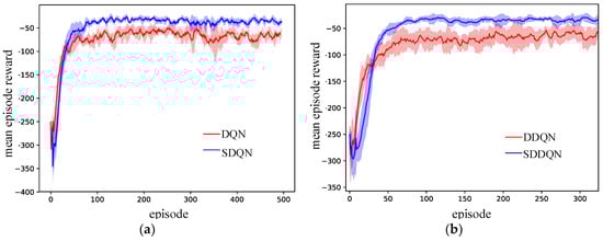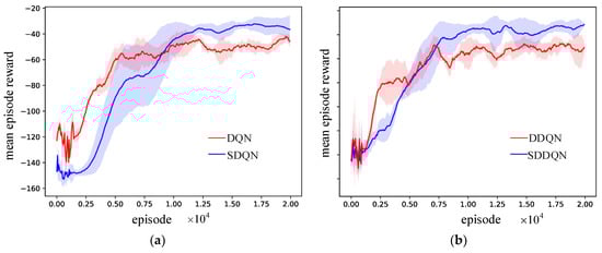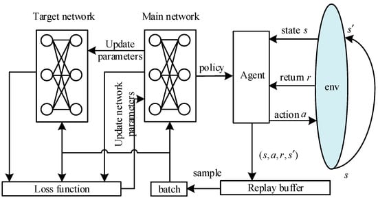 Hado et al. proposed the Double-DQN algorithm (DDQN) to solve the problem of overestimation in the DQN algorithm []. DDQN does not directly select the max  value in the target network but uses the corresponding action of the max  value in the main network to determine the target  value in the target network. The Loss function of DDQN is