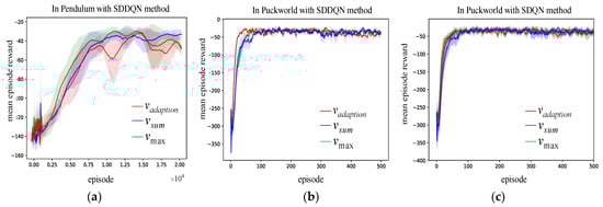 As shown in the Figure 6, the performance of SDQN and SDDQN algorithms with different  computing methods does not differ greatly in both Pendulum and Puckworld scenarios, especially in Puckworld scenario, the performance of the algorithms is much the same. In Pendulum scenario, the performance of SDDQN with  is slightly worse, but it is the best in Puckworld scenarios. The performance of SDQN with  is not the best in Puckworld scenarios. These results show that the impact of different  on SRLVF performance is related to RL algorithm and scenarios, so the  computing method needs to be selected according to the specific situation.
