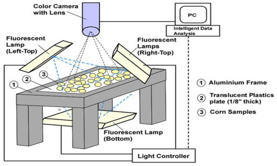 Previous studies have demonstrated that computer vision could be a significant way to analyze grains. Zayas et al. used image processing and pattern recognition to identify whole and broken corn kernels [5]. Ni et al. developed a prototype system to classify whole and broken kernels [6], corn kernels based on their crown shape [7], and grade corn based on their size [8]. Luo et al. used computer vision technology to separate six types of wheat kernels based on their color features [9]. Steenhoek et al. devised a computer vision system to classify corn based on their damage type [10]. Dana and Ivo used image processing to categorize flax cultivar based on seed shape and color [11]. Chen et al combined machine vision and pattern recognition to classify five types of corn based on their shape, color, and geometric features [12]. Arribas et al. presented an automatic leaf image classification system for sunflower crops using neural networks [13]. Gao et al. designed a rapid corn sorting algorithm based on machine vision. The proposed corn classification had a speed of 30 ears/min with a 1280 × 1024 pixel CCD camera [14]. Valiente-Gonzalez et al. devised a computer vision system to automatically evaluate the quality of corn lots by identifying damaged kernels that combined algorithm-based computer vision techniques and principal component analysis (PCA) [15]. Liu et al. proposed an efficient image processing algorithm to detect parameters such as the length, the number of ear rows, and the quantity of kernels in an ear of corn based on a machine vision [16]. Mohammad et al. designed an expert system with ant colony optimization (ACO) to automatically recognize different plant species through their leaf images [17]. Gao et al. designed an automatic detection and classification algorithm for corn product quality and equipment [18]. The algorithm firstly calculated texture features of fresh corn images through wavelet analysis and then measured the separation degree of texture features by the maximum visual entropy function. Finally, according to the texture features and entropy criterion, the fresh corn products were classified. Sun et al. identified and classified damaged corn kernels including undamaged, insect-damaged, and mildew-damaged by using impact acoustic multi-domain patterns [19]. Zhang et al. classified three different degrees of freeze-damage in corn seeds using a VIS/NIR hyperspectral imaging system [20]. Chouhan et al. used computer vision and soft computing methods to identify and classify diseases of the leaf for the plant [21]. Sajad et al. developed a computer vision algorithm that combined color features and a classifier based on ANN with genetic algorithms for detecting existing fruits in aerial images of an apple cultivar and estimating their ripeness stage [22]. These proposed systems mainly focused on algorithms, but the research on classification of damaged corn is less and has paid little attention to the design of corn image capture platforms. In addition, most of them worked well for a small scale of corn, however, since touching corn could not be segmented accurately, their performance may be degraded if the number of corns is increased.