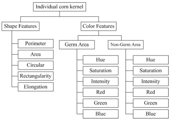 For shape features, we extracted five dimensional measurements of segmented corn, i.e., perimeter, area, circularity, rectangularity, and elongation, which were adjusted from the work of Zheng (2008) used for categorizing maize seed [27].