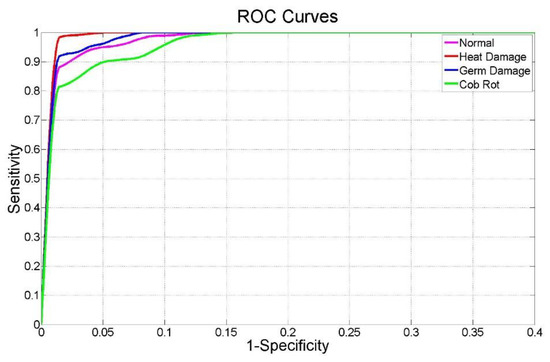 Figure 9 depicts the ROC curves of the developed corn classification system for the four defined classes. On the other hand, Table 4 shows the performance results of the classification method using sensitivity, accuracy, and specificity and the area under the ROC curve (AUC) for each class.