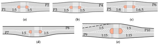 Diagrams of the analysed pedestrian refuges: (a) symmetric, 2 m wide (entry zone); (b) symmetric, 2 m wide (entry zone; after centre island); (c) symmetric, 2 m wide (between two centre islands, both positioned on one side of the centreline); (d) 2.5 m wide pedestrian refuge on one side of the centreline (end of entry zone/beginning of the village centre area); (e) asymmetric, 4 m wide (village centre, asymmetric shift of the lane alignments by 1 m and 3 m respectively). The test sections P1, P2, … Pn, are marked on the respective travel lanes before the pedestrian refuges, in this way indicating the traffic direction under analysis.