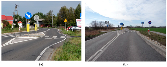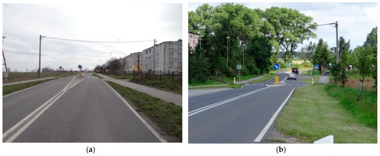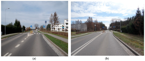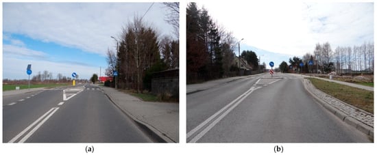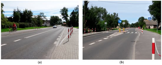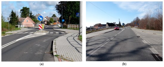 Two other pedestrian refuges under analysis were located on the stretches surrounded by residential buildings in close proximity (Figure 3) or without any buildings in the surrounding environment (Figure 4). With most of analysed central refuges situated in the settlement areas (Figure 1, Figure 2, Figure 3, Figure 4, Figure 5, Figure 6, Figure 7, Figure 8, Figure 9 and Figure 10), in two cases they were located in the entry zones, preceded by gateway islands (Figure 3b and Figure 4a). These pedestrian refuges were located quite close to the gateway islands, namely ca. 170 m away. In one case, a very good view was ensured in both directions of travel (Figure 3). The pedestrian refuge included a 2 m wide island and 1:5 tapered markings. In the other case, the gateway island positioned on the approach lane was followed by a horizontal curve (Figure 4b) completely obscuring view on the course of the departure section. The pedestrian refuge presented in Figure 4 has a 2 m wide island and hatched markings with different taper rates of 1:8 on the entry side (Figure 4a) and 1:6.5 on the departure side (Figure 4b), viewing in the direction of the village centre, to accommodate the nearby collector road junction.