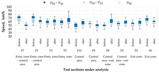 Taking into account the recommendations of [1,5] that retrofitting of pedestrian refuge scan have a speed reducing effect and improve the safety of vulnerable road users on their way across the street, as the first step the authors analysed the speeds measured upstream of the pedestrian refuge vbefore. The analysis of the values of vbefore given in Table 2 showed that in no case was the 85th percentile of free-flow speed smaller than 50 km/h, i.e., the speed limit in residential areas. According to the mentioned guidelines [5] the pedestrian refuges should be located where warranted and their geometry should induce reduction of vehicular speed to 50 km/h and less. This requirement is not satisfied by the pedestrian refuges under analysis. However, the average free-flow and stable-flow speeds on the test sections No. P8 and P10 were smaller than 50 km/h.